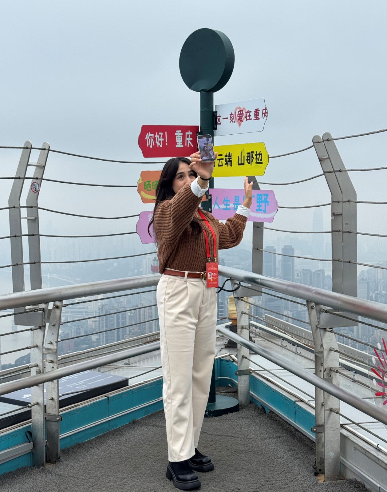 当日下午,中阿记者代表团抵达位于渝中半岛核心区的 WFC 观景台,在 75 层露天观景区开启了高空探秘之旅。这座海拔 590 米、建筑高度 339 米的观景平台可以360° 无遮挡视野可将长江、嘉陵江交汇盛景与十七座跨江大桥尽收眼底。对于多数首次到访重庆的阿拉伯国家记者而言,高低错落的立体城市格局带来强烈视觉冲击,他们纷纷举起相机、手机拍摄打卡,并不时向工作人员询问城市建设细节,直言 “被这种山水与城市共生的独特风貌深深吸引”。