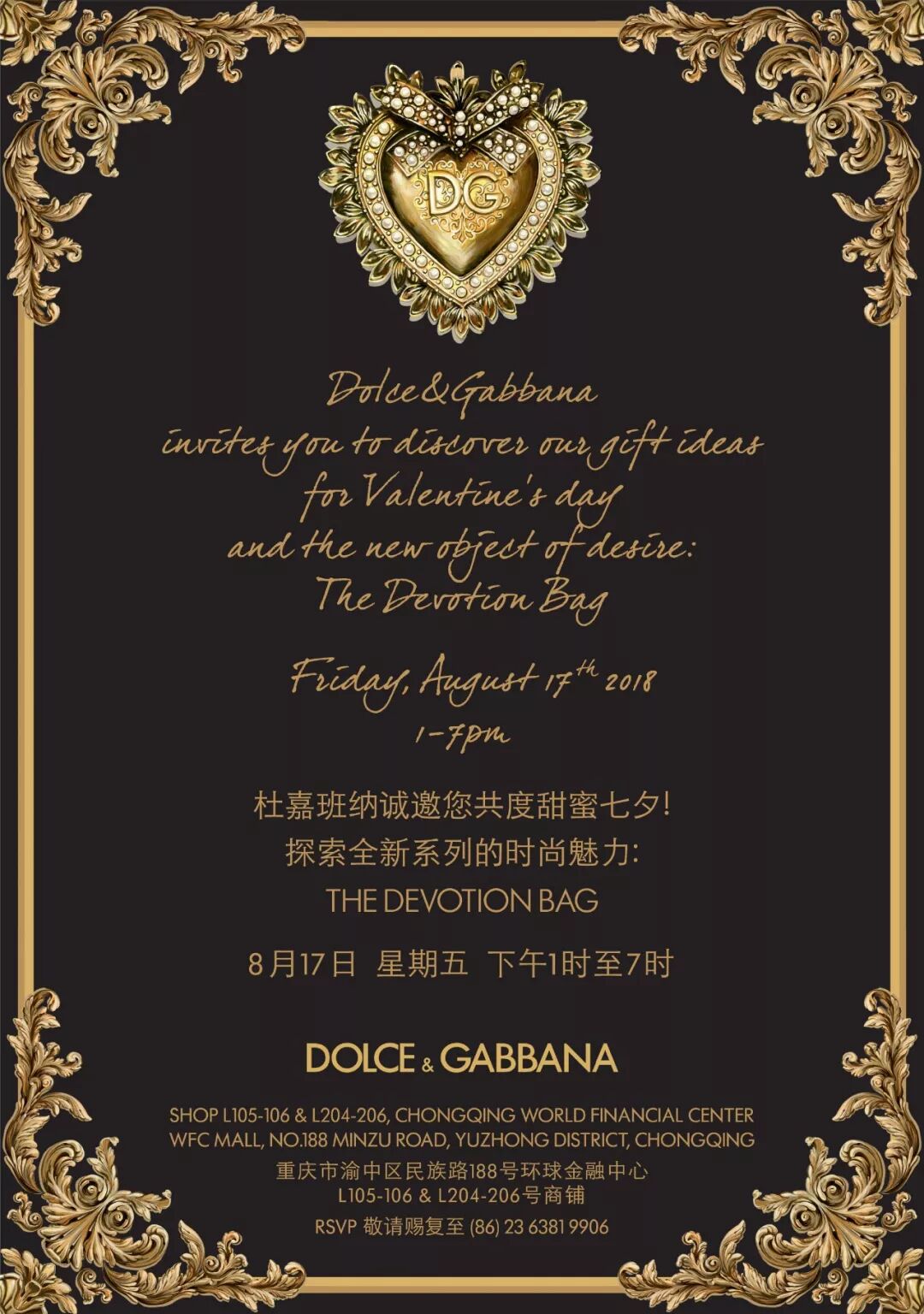 8月17日(周五),Dolce&Gabbana重庆WFC精品店将举行七夕主题活动,