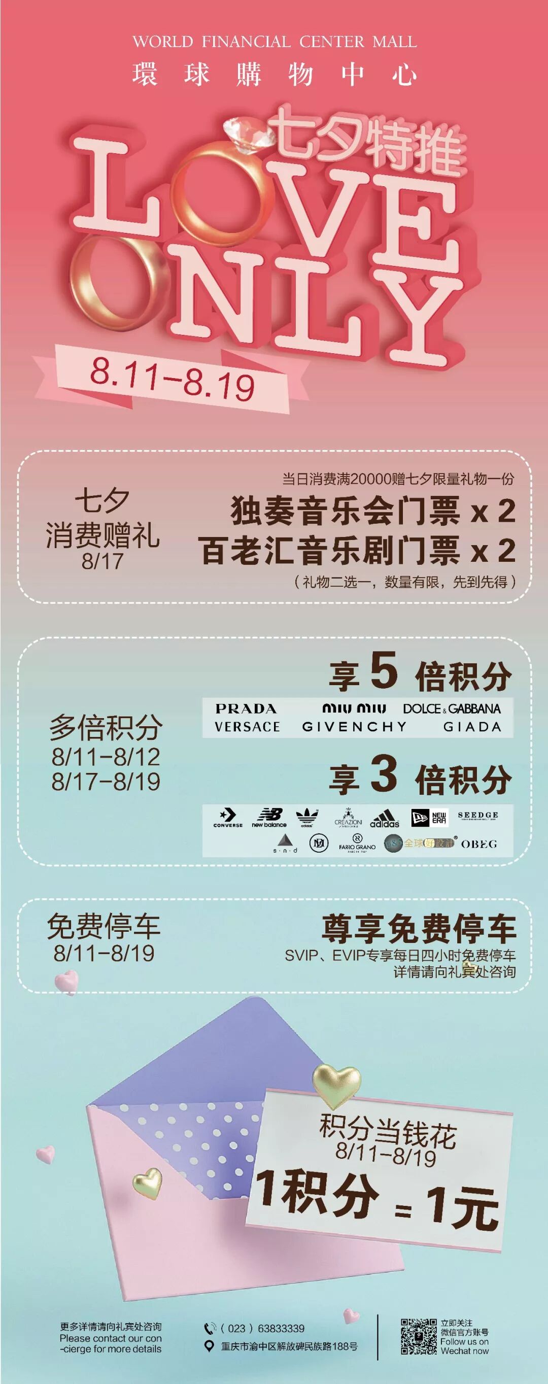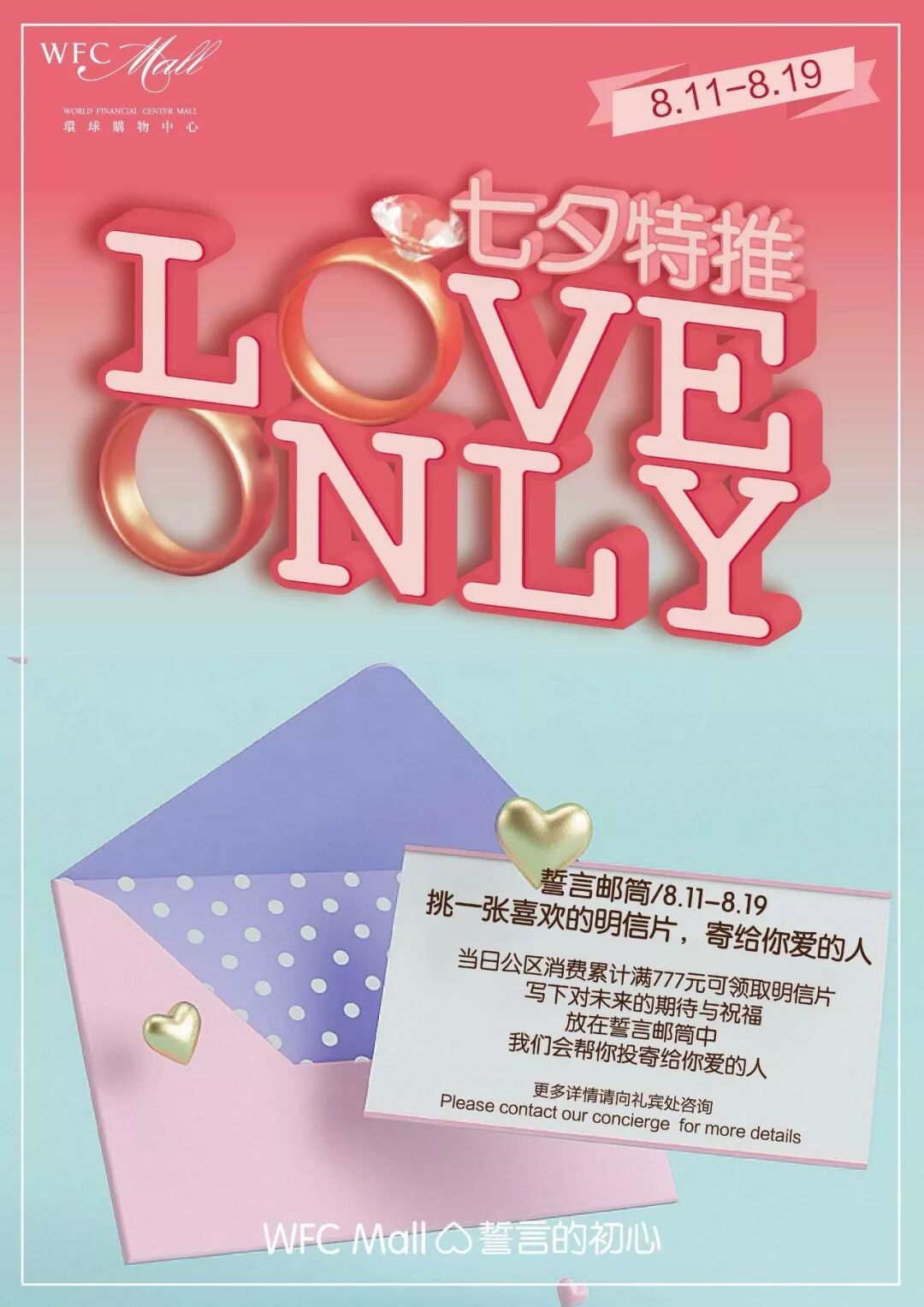 浪漫七夕之际,不想淹没在花式秀恩爱之中?8.17-8.19,来WFC约个会逛逛街,为感情增添仪式感,是感谢也是纪念。各品牌时髦尖货与惊喜优惠的双重购物享受尽在WFC。现在就为您奉上早已贴心准备好的玩转七夕浪漫攻略。