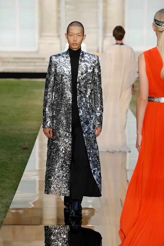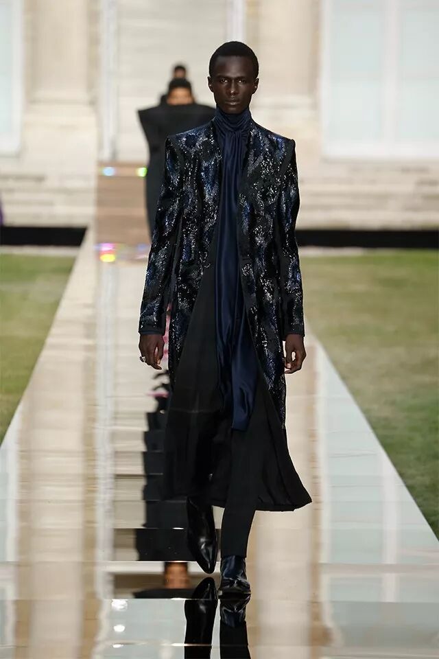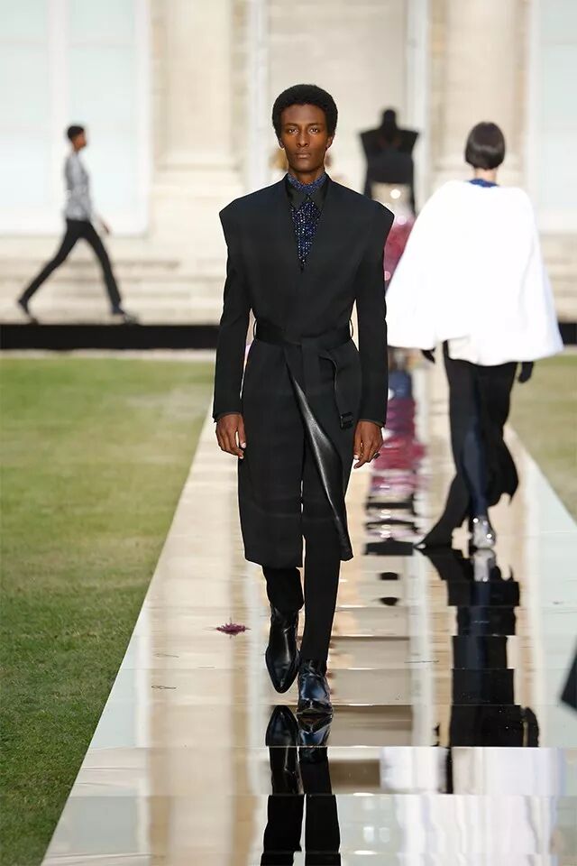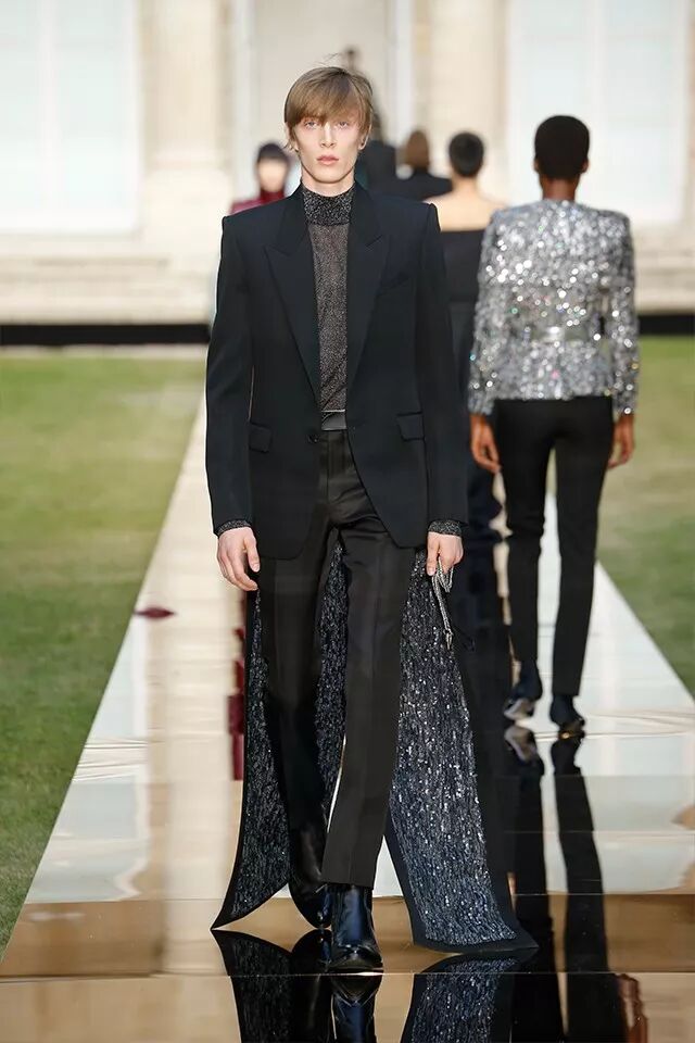 男女装的界限在此次大秀中进一步模糊,强调肩线与腰线对比的女装以强势风格表现亦刚亦柔的魅力。而系列中肃穆优雅的男装灵感来自Hubert de Givenchy先生钟爱的男士造型,如经典的双排扣外套、红色披肩、流线型修身剪裁的西服套装和高领内搭。在此基础上,结合了极简美学,用挺括的肩型和利落的线条,为男士晚装燕尾服和以水晶及玛瑙为灵感的刺绣长款大衣打造出毫不费力的优雅,展现出高贵的绅士风格。