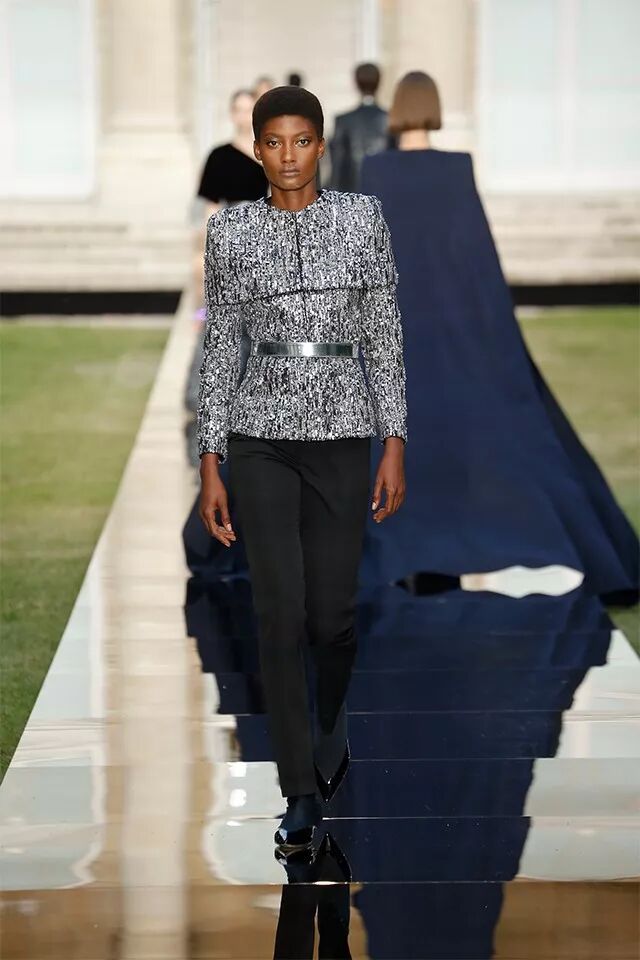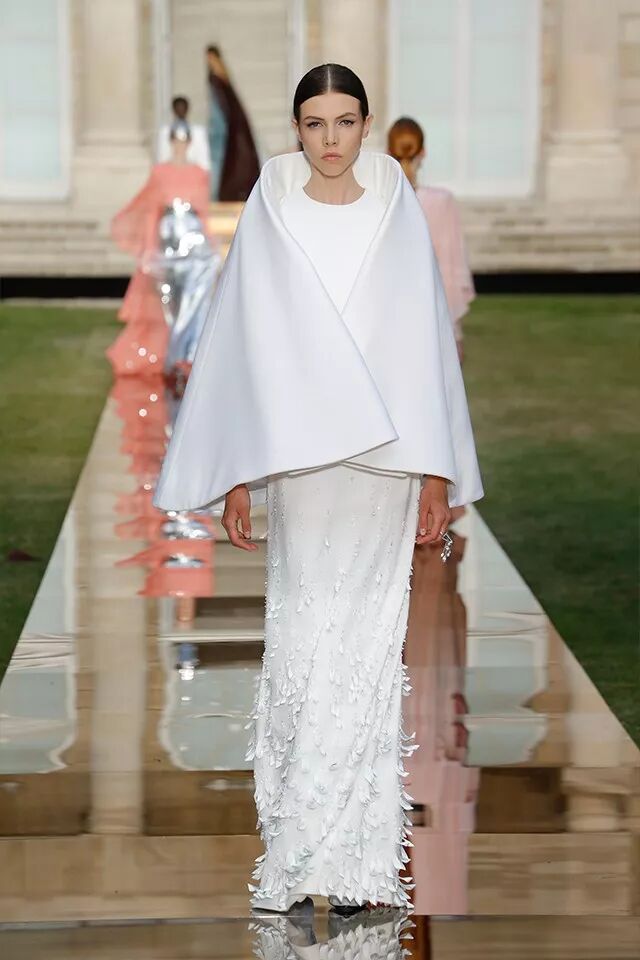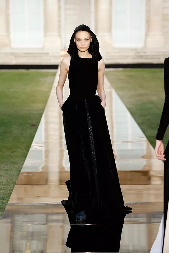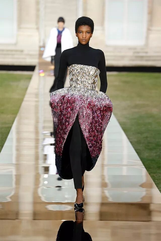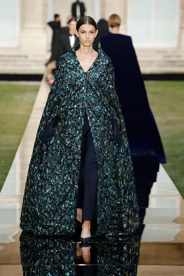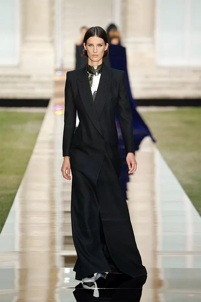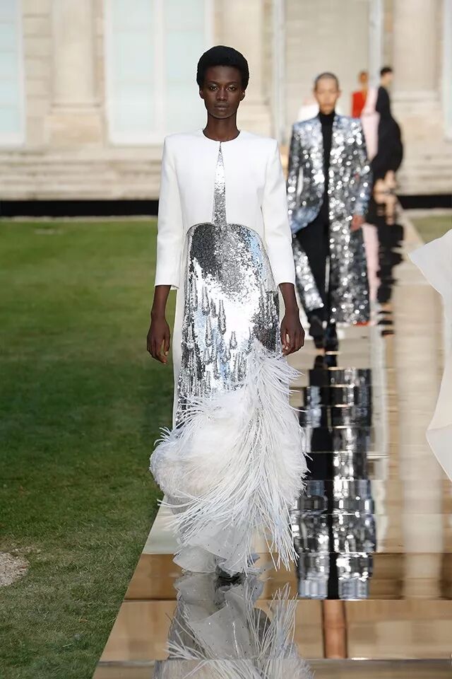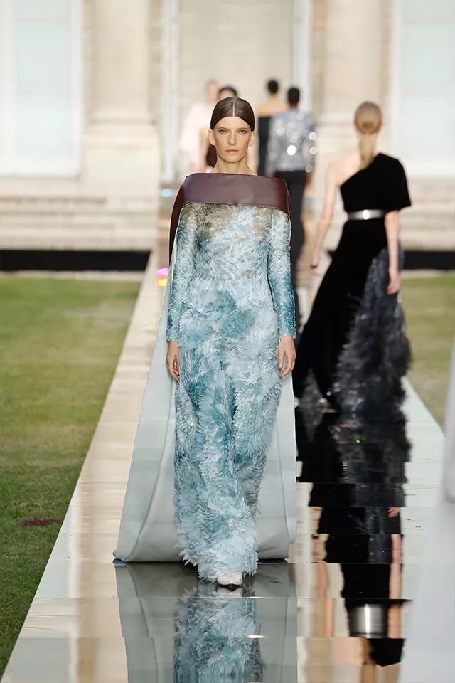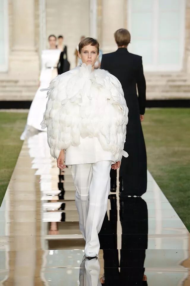 在秀前释出的预告信息中就令人无比期待的羽毛装饰工艺在整场大秀中令人过目难忘。渐变的羽毛拼接刺绣长裙,不规则剪裁披风边缘飘动的鸵鸟毛装饰,或是为全身黑色增添分量层次的羽毛披风,高级定制的手工艺术与对细节的完美追求在此得到体现。