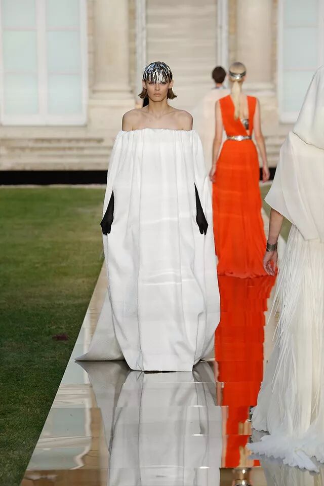 金属配饰与秀场走道相互辉映,无论是为简洁设计带来灵动微风的华丽耳饰,复古而又充满未来感的头饰或是金属色尖头高跟鞋都为整体古典矜持的设计带来灵动气息。