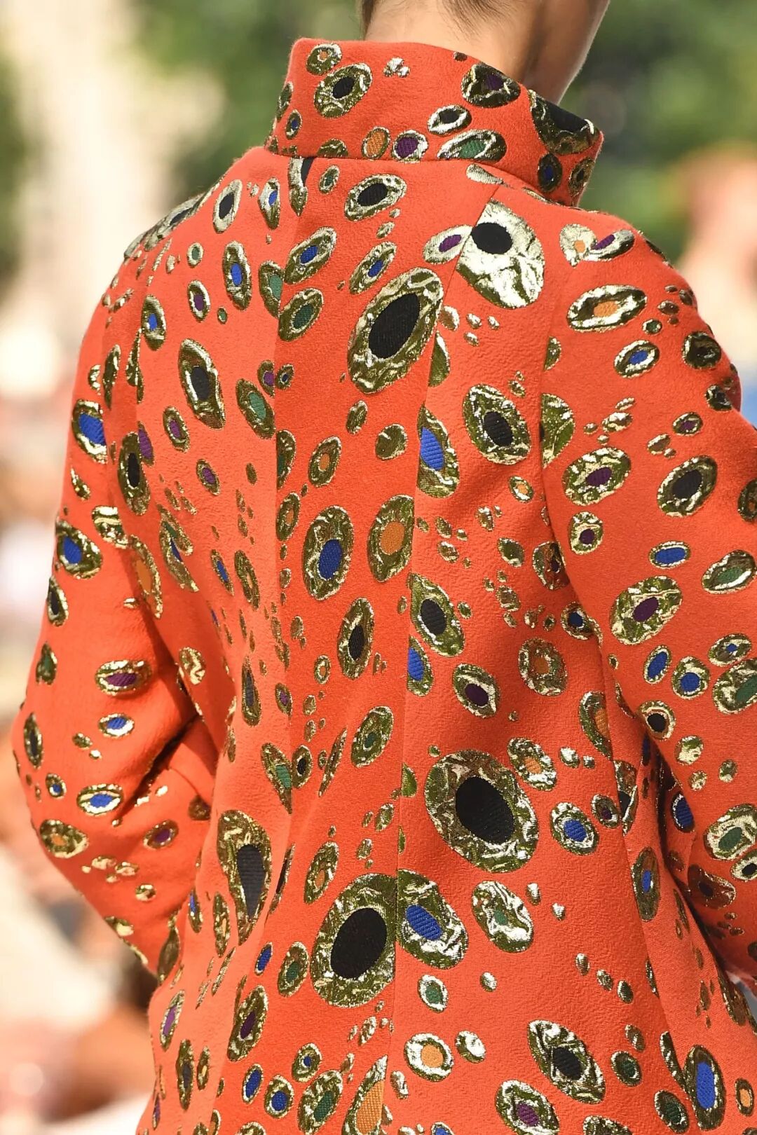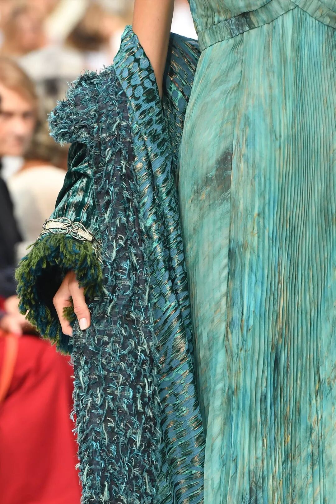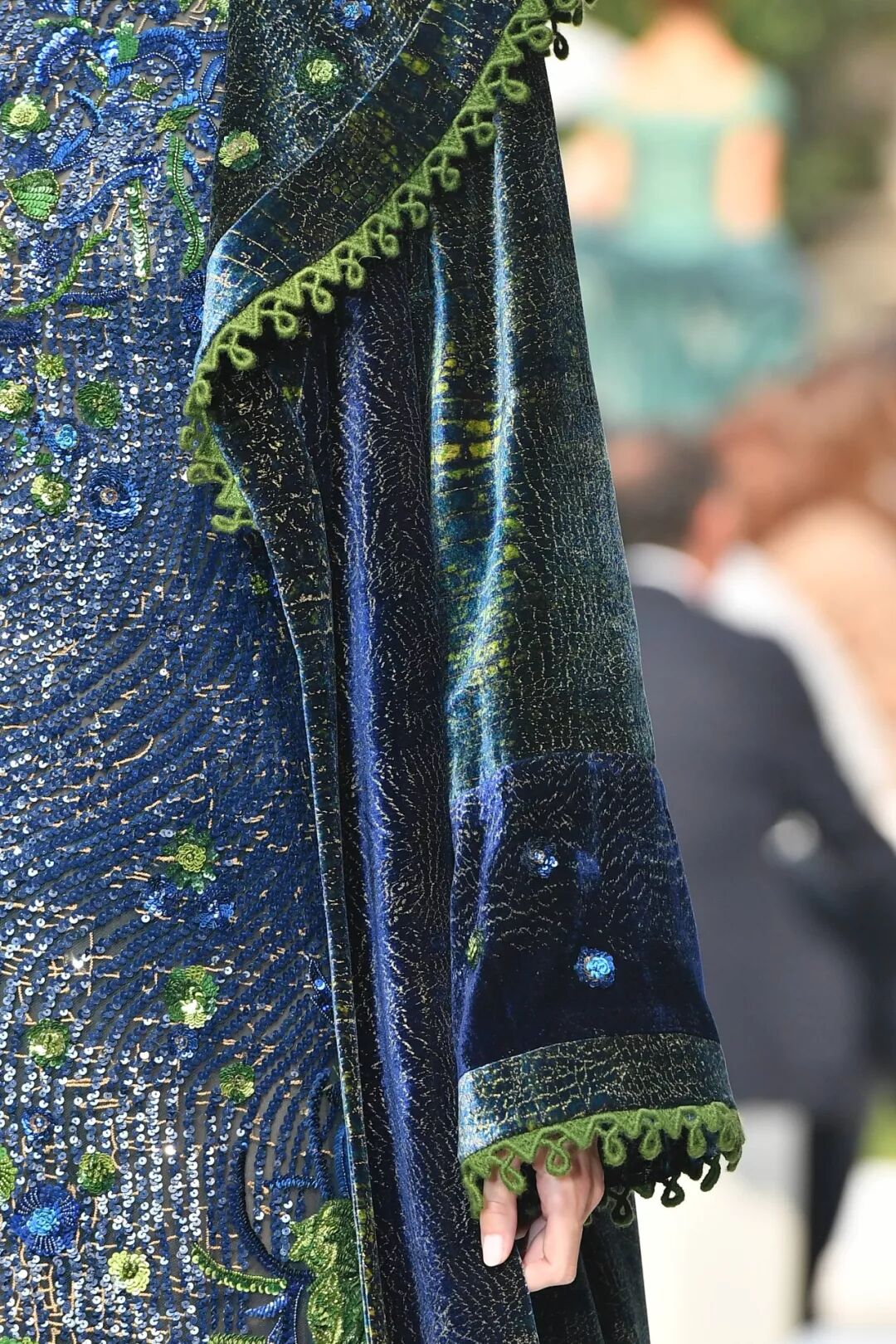 克林姆特在创作中期吸收了拜占庭镶嵌画和东欧民族的装饰艺术的营养,致使他的画具有“镶嵌风格”。 所以本次高定系列处处可以看到镶嵌画和东欧装饰艺术的影响。一件用涂鸦钻石装饰的大麦花呢小外套是最能致敬克林姆特的象征物件,星空以及水基绿和阿特西岛夏日夜晚的深蓝色交汇成的交响乐章像一首诗,被紧身衣上最细小的亮片和同色系天鹅绒大衣诠释出来。皮革和发光的金色掐丝交织在一起,缝在层层浅蓝色雪纺上。本次高定系列中,有许多古色古香的珍贵织物,波纹状的表面,镶嵌的纽扣和胸针,金属元素和石头的应用,这些是奢华、狂野和鲜活生动的细节,透明感和丰富性围绕着身体,在自相矛盾中寻求一种有如炼金术般的和谐状态。
