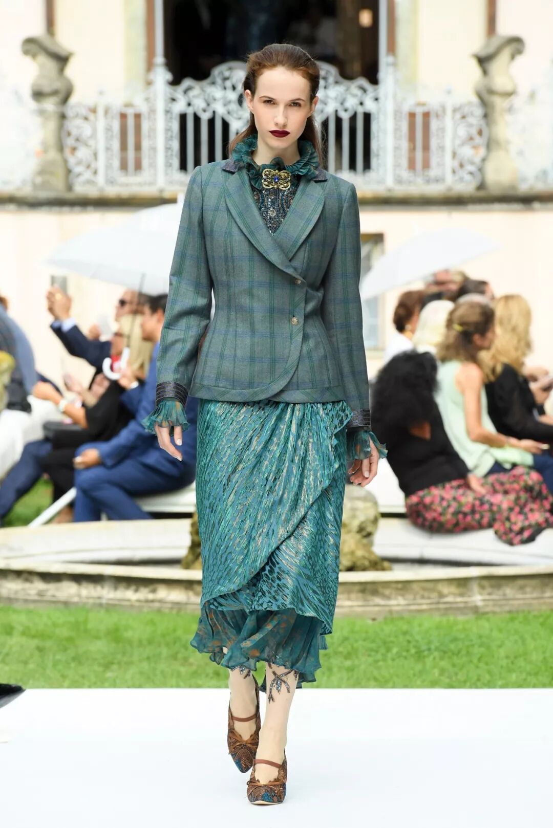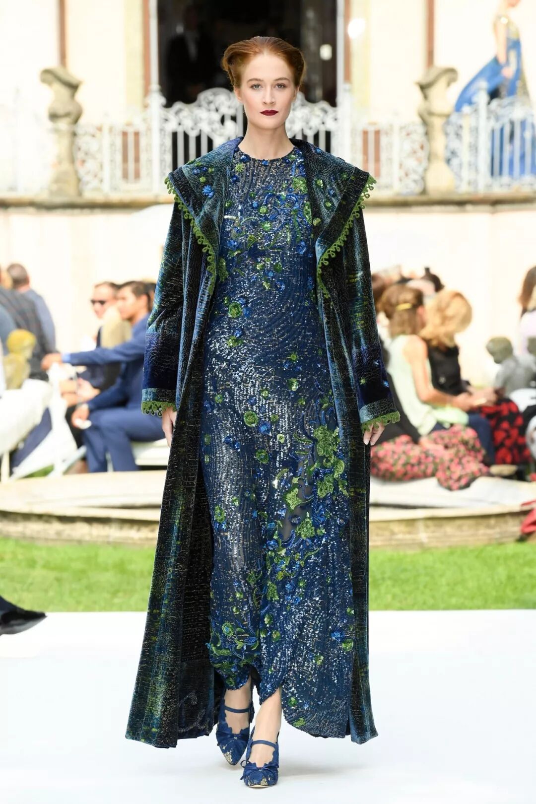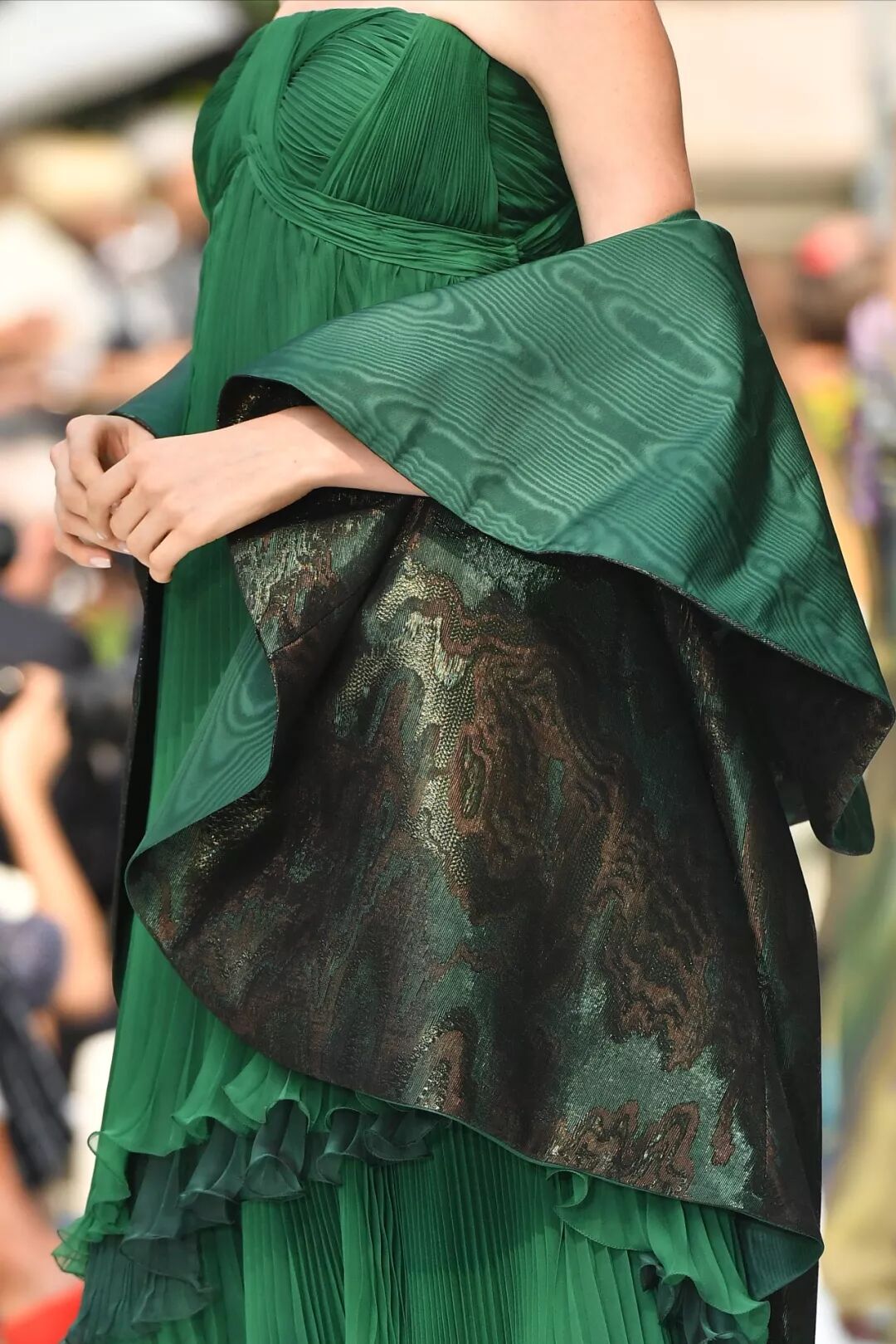 克林姆特在创作中期吸收了拜占庭镶嵌画和东欧民族的装饰艺术的营养,致使他的画具有“镶嵌风格”。 所以本次高定系列处处可以看到镶嵌画和东欧装饰艺术的影响。一件用涂鸦钻石装饰的大麦花呢小外套是最能致敬克林姆特的象征物件,星空以及水基绿和阿特西岛夏日夜晚的深蓝色交汇成的交响乐章像一首诗,被紧身衣上最细小的亮片和同色系天鹅绒大衣诠释出来。皮革和发光的金色掐丝交织在一起,缝在层层浅蓝色雪纺上。本次高定系列中,有许多古色古香的珍贵织物,波纹状的表面,镶嵌的纽扣和胸针,金属元素和石头的应用,这些是奢华、狂野和鲜活生动的细节,透明感和丰富性围绕着身体,在自相矛盾中寻求一种有如炼金术般的和谐状态。