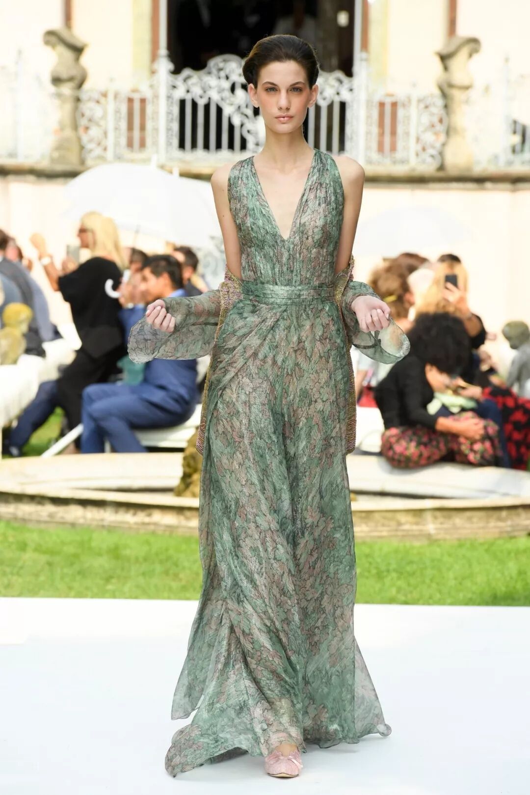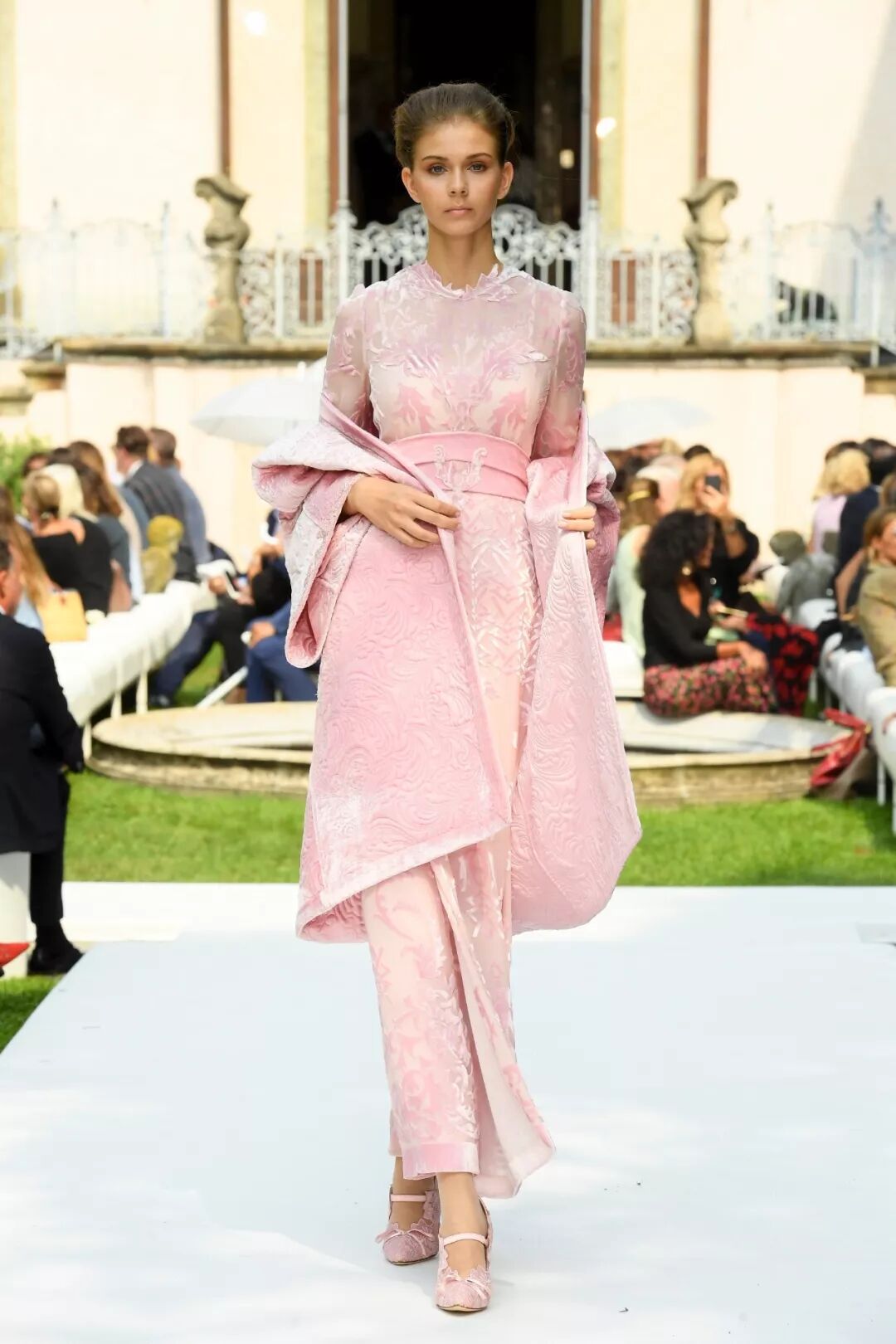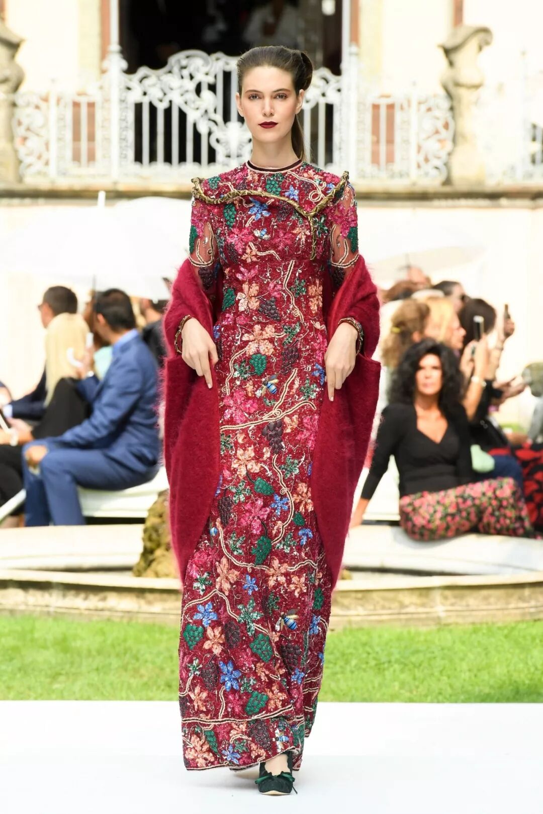从进入庭院开始,便进入了时空胶囊中,从文艺复兴走入象征主义的艺术空间,阳光交织着树影,奇幻之旅就此开始。本季高级定制礼服的灵感来源是古斯塔夫·克里姆特(Gustav Klimt1862-1918年)的画作,奥地利表现主义画家。其画面具有强烈的装饰色彩,辉煌的色彩伴随着扭曲的人体,透出情欲和略带颓废的美,伤感而又神秘。克里姆特生于维也纳一个制作金银首饰的世家,因此他在作品中运用沥粉、贴金箔、嵌螺钡、贴羽毛等等特殊技巧,取得特殊的艺术效果。