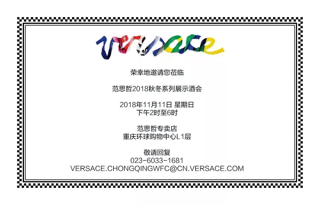 Versace 范思哲将在11月11日(周日)下午2时至6时,于范思哲重庆环球购物中心专卖店举行2018秋冬系列展示酒会。这一季, 来感受 Versace 大家庭的面貌,品牌珍重的价值观,无惧展现可谓破格前卫的态度,同时宣示多元与创新的精神。