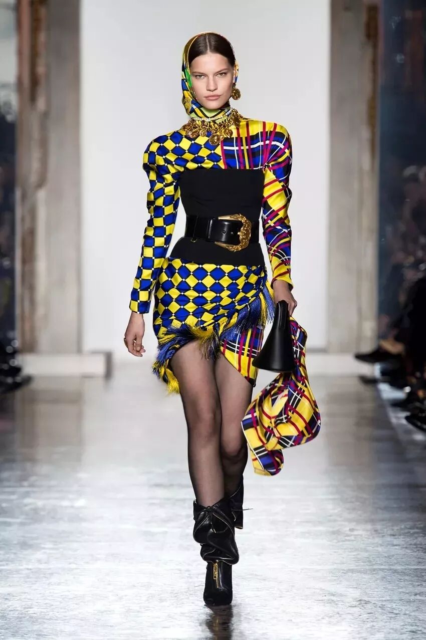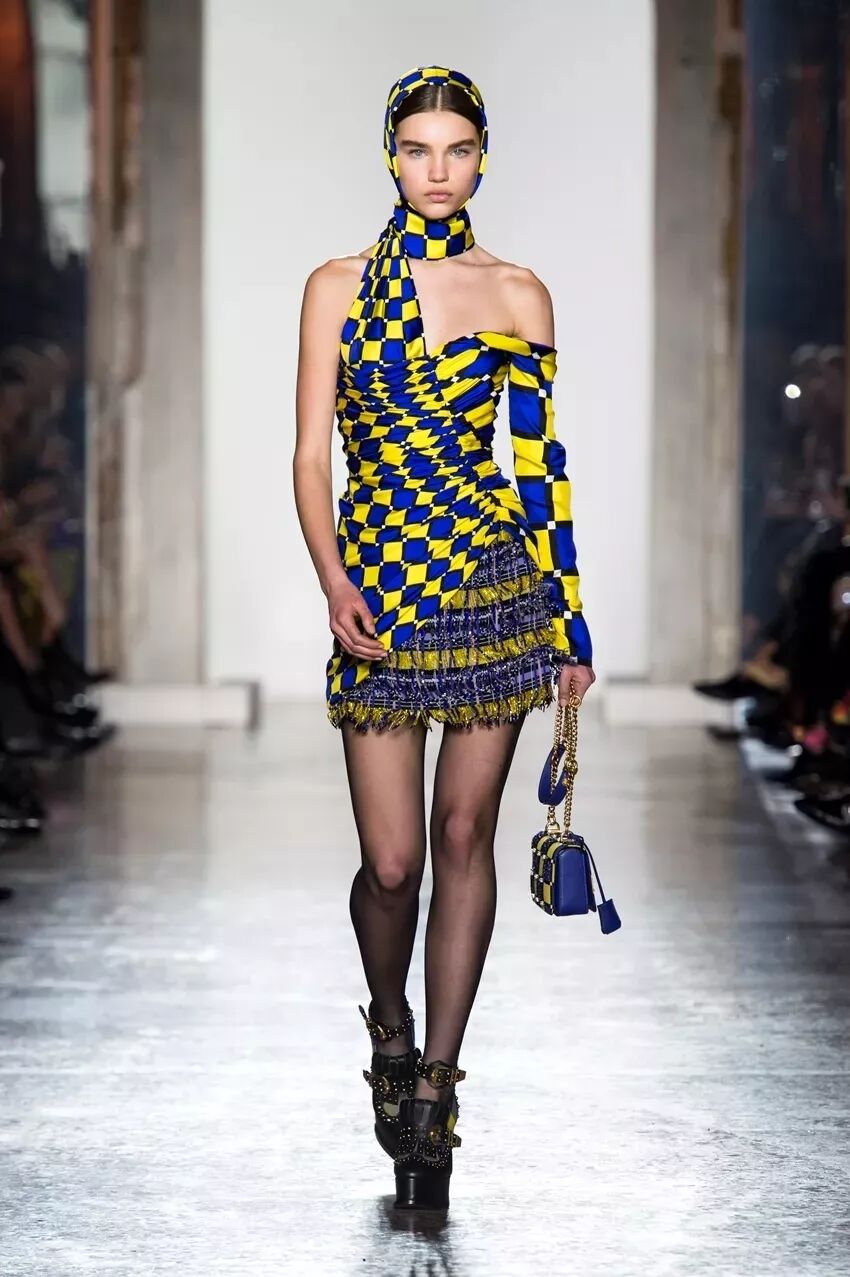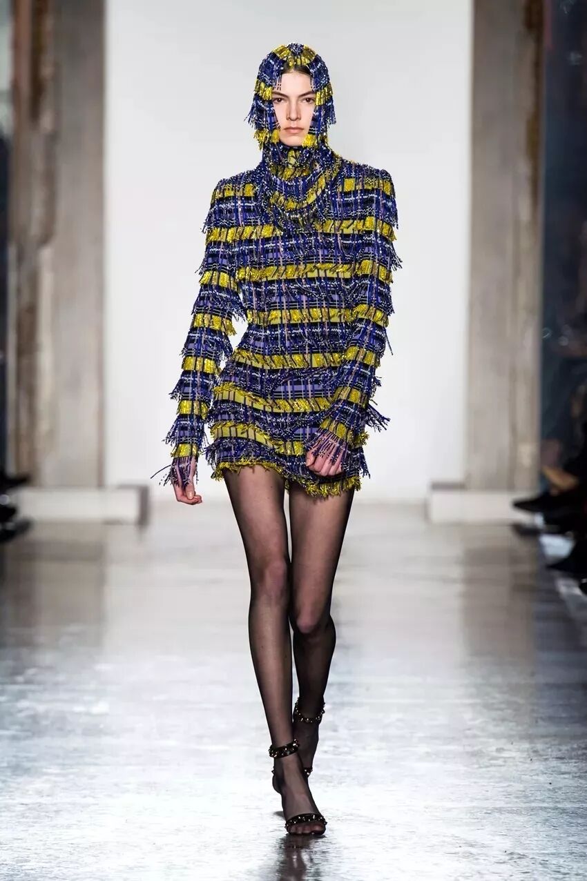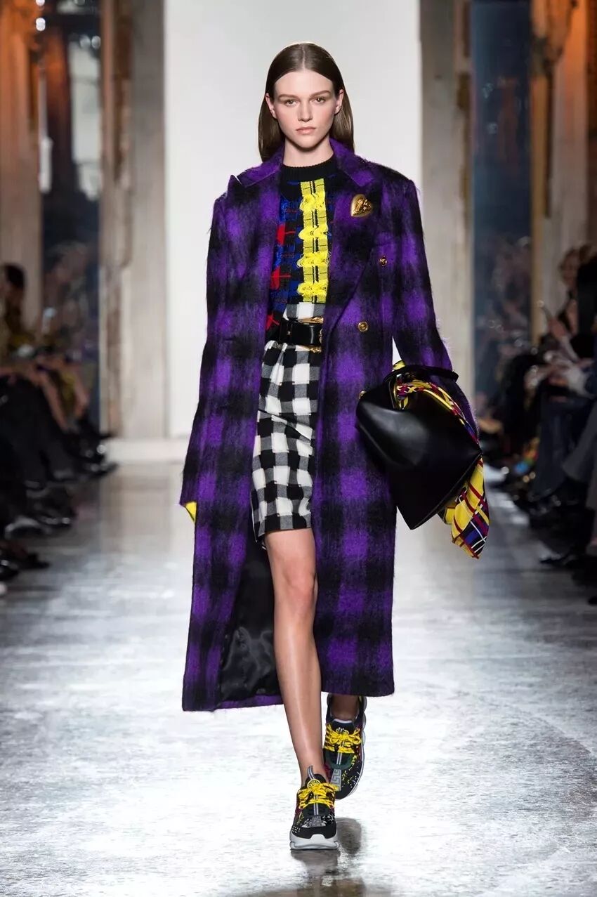 连衣裙上的足球风流苏围巾,为晚装赋予恰到好处的夺目格调。不同款式的格纹以看似随意的手法互相搭配,象征次文化的冲击。