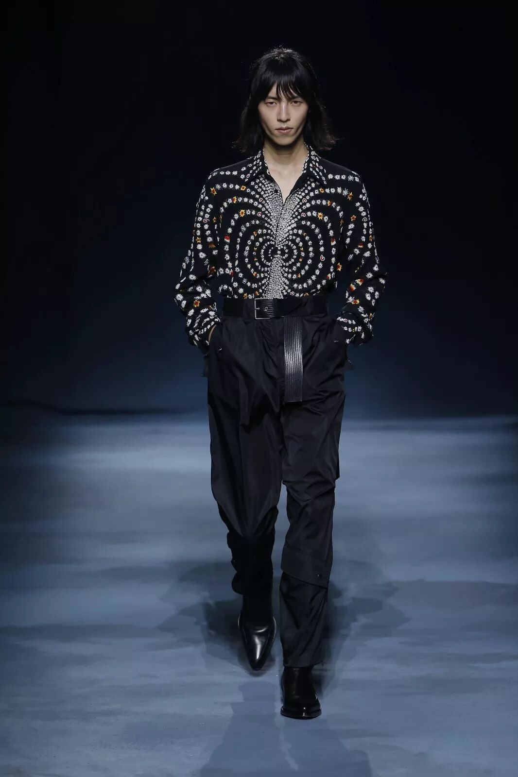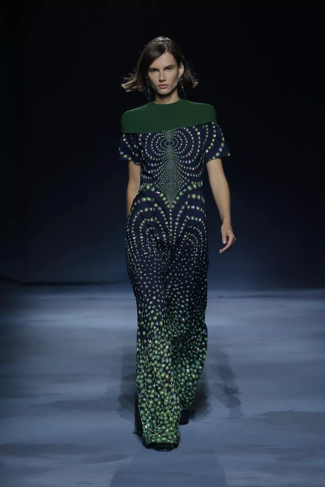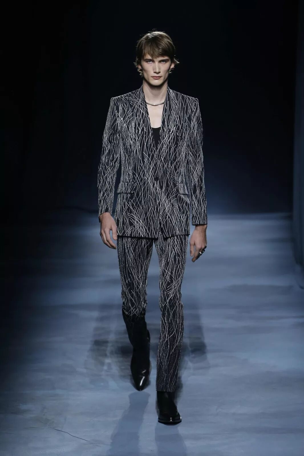 一组灵感源自网络时代电脑屏幕的印花多次出现,不论运用在真丝衬衫的印花上还是以手工钉珠来立体呈现,最终幻化出繁多的视觉感受。同样通过男、女装的不同演绎,再次呼应出艺术总监Clare Waight Keller这一次想要说的雌雄同体风貌。