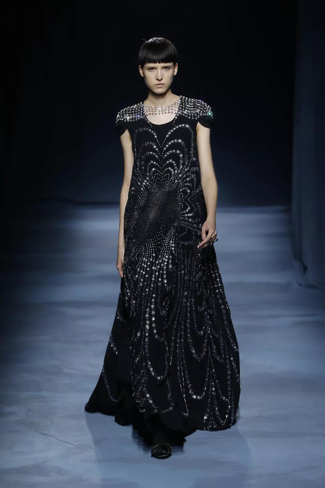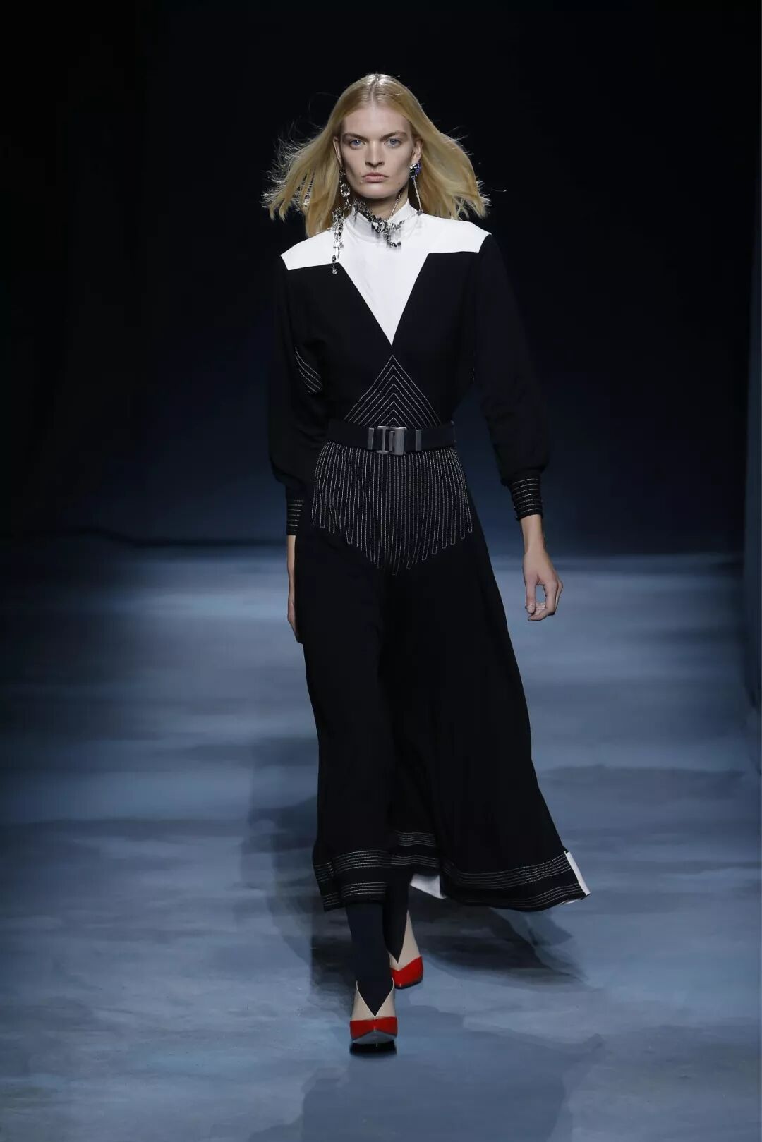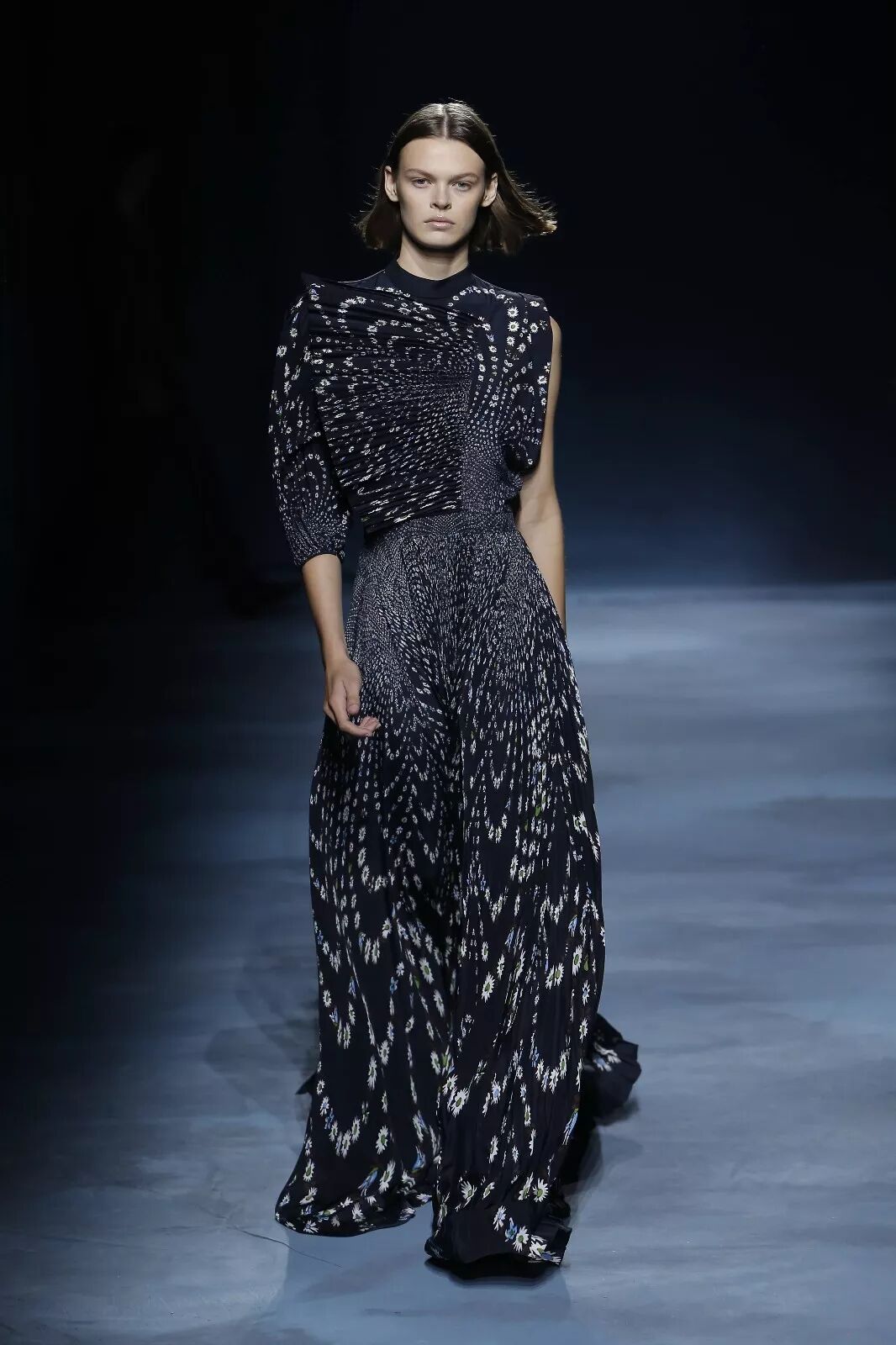 一组灵感源自网络时代电脑屏幕的印花多次出现,不论运用在真丝衬衫的印花上还是以手工钉珠来立体呈现,最终幻化出繁多的视觉感受。同样通过男、女装的不同演绎,再次呼应出艺术总监Clare Waight Keller这一次想要说的雌雄同体风貌。