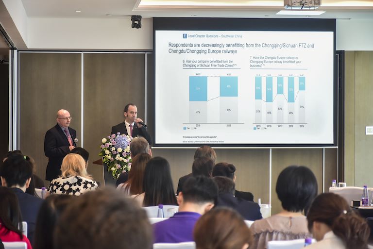 中国欧盟商会西南分会副主席Dominik Widmer提到,26%的受访企业认为目前的营商环境比起刚进军中国市场时更友好。而在西南区域这一数据则达到39%,在全国各区域调查数据中居于第二高。他认为,这说明了欧洲企业普遍认为在重庆、成都等西南地区的竞争环境更公平,市场开放程度和市场准入放宽等方面都有了明显提升和优化。