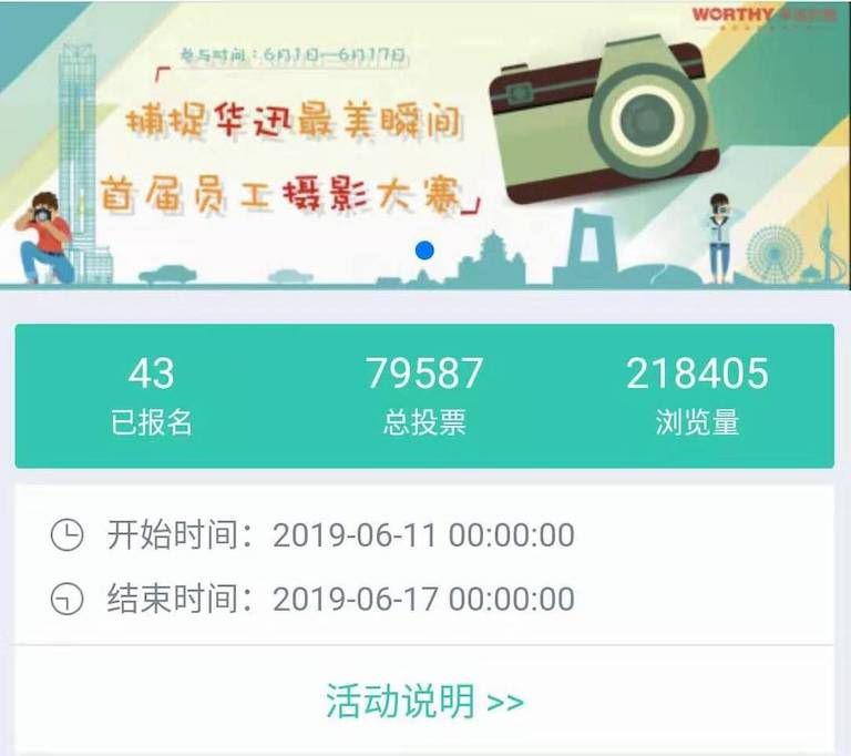 此次员工摄影大赛于6月份正式启动,共收到集团直属各部门、分子公司报送的职工摄影作品近百余幅,精心挑选出具有岗位风貌和WFC风采代表性的作品,并开通投票通道,短短7天时间,投票通道访问量达218405人次,投票数79587票,足以看出员工对活动的参与度和支持度。