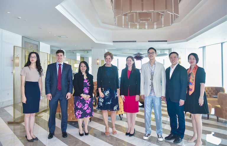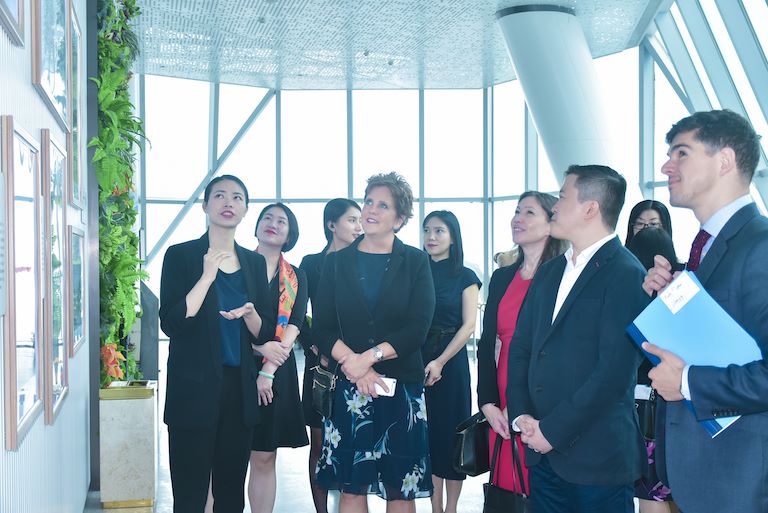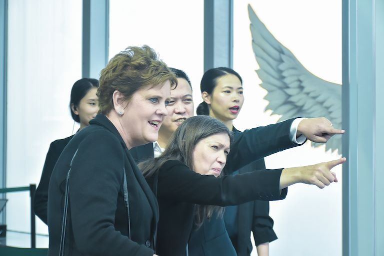 【华迅地产/总经办】9月9日,英国外交部经济和全球事务总司长Menna Rawlings、公使衔参赞Danae Dholakia,英国驻重庆总领事Cecille El Beleidi、副总领事Daniel Rothberg、商务处处长陈宇、总司长私人秘书Yaseen Salem及英国奥雅纳工程咨询公司重庆办公室负责人一行莅临重庆环球金融中心(以下简称WFC)观景台参观,集团总裁李鹏、租售部营销总监高瑜、总经办主任胡丽娜、副主任董梅及观景台运营经理任晏陪同参观,并对Menna Rawlings女士一行的到访表示热烈欢迎。