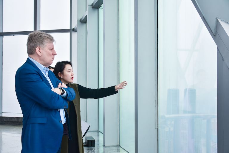 随后,华迅控股集团租售部营销总监高瑜、观景台运营经理任晏陪同埃斯科•阿霍到重庆环球金融中心会仙楼观景台参观。参观过程中,高总向埃斯科•阿霍详细介绍了WFC的设计理念、建造过程、业态分布和运营情况。
