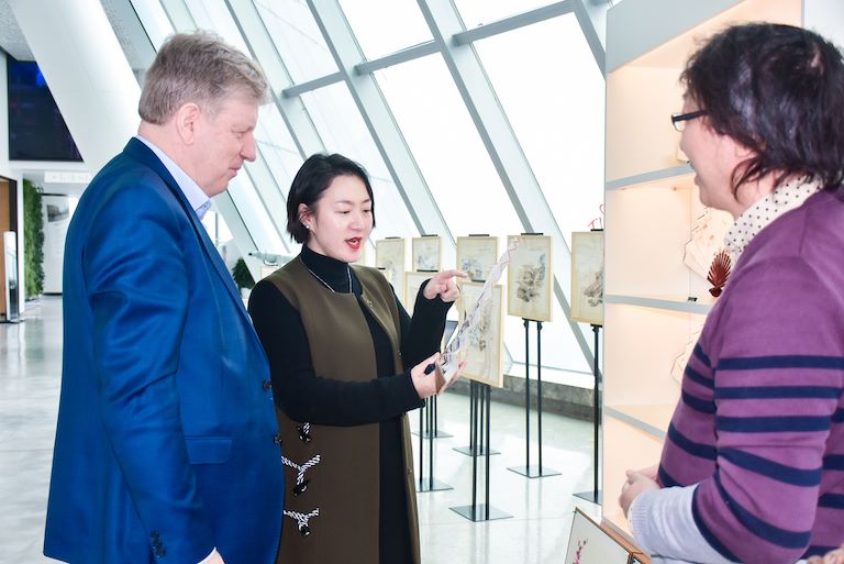 上图:高总向埃斯科•阿霍介绍传统国画纸扇